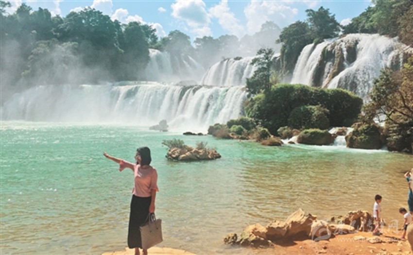 游客在廣西大新縣德天瀑布景區(qū)留影。獨特的景色使德天瀑布“十一”期間吸引了眾多游客。斯 諾攝