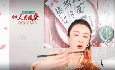 在人民日報(bào)新媒體“為鄂下單”系列直播湖北團(tuán)圓專場,網(wǎng)紅主播正在展示湖北特色食品熱干面。