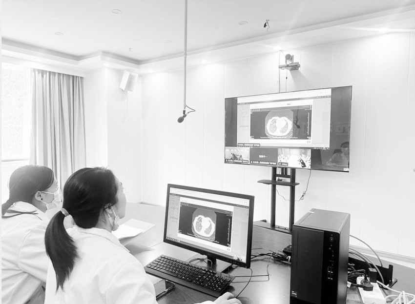 白玉縣人民醫(yī)院醫(yī)生與成都市第七人民醫(yī)院醫(yī)生隔屏對話,為一腹痛患者會診。(受訪者供圖)
