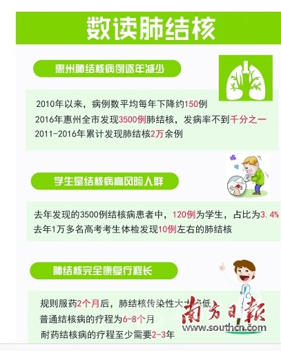 據(jù)惠州市結(jié)防所相關(guān)負(fù)責(zé)人介紹,惠州市近年(2011—2016年)發(fā)現(xiàn)肺結(jié)核病例2萬(wàn)余例,絕大部分患者都能治愈,治愈率達(dá)到90%以上。2010年的一項(xiàng)流行病學(xué)調(diào)查顯示,惠州市結(jié)核病發(fā)病率為千分之二,目前這一數(shù)字已降至不到千分之一?!叭ツ臧l(fā)現(xiàn)3500例,發(fā)病率略低于全省平均水平,并且發(fā)病趨勢(shì)近年來逐年下降,2010年以來,病例數(shù)平均每年下降約150例?!眲⒅緰|表示,這跟防控工作的成效以及人們防護(hù)意識(shí)的提高密不可分。然而,目前結(jié)核病的防治仍然面臨嚴(yán)峻的形勢(shì):一是發(fā)病人數(shù)多;二是耐藥結(jié)核病流行;三是學(xué)校存在發(fā)生結(jié)核病疫情的潛在風(fēng)險(xiǎn)。