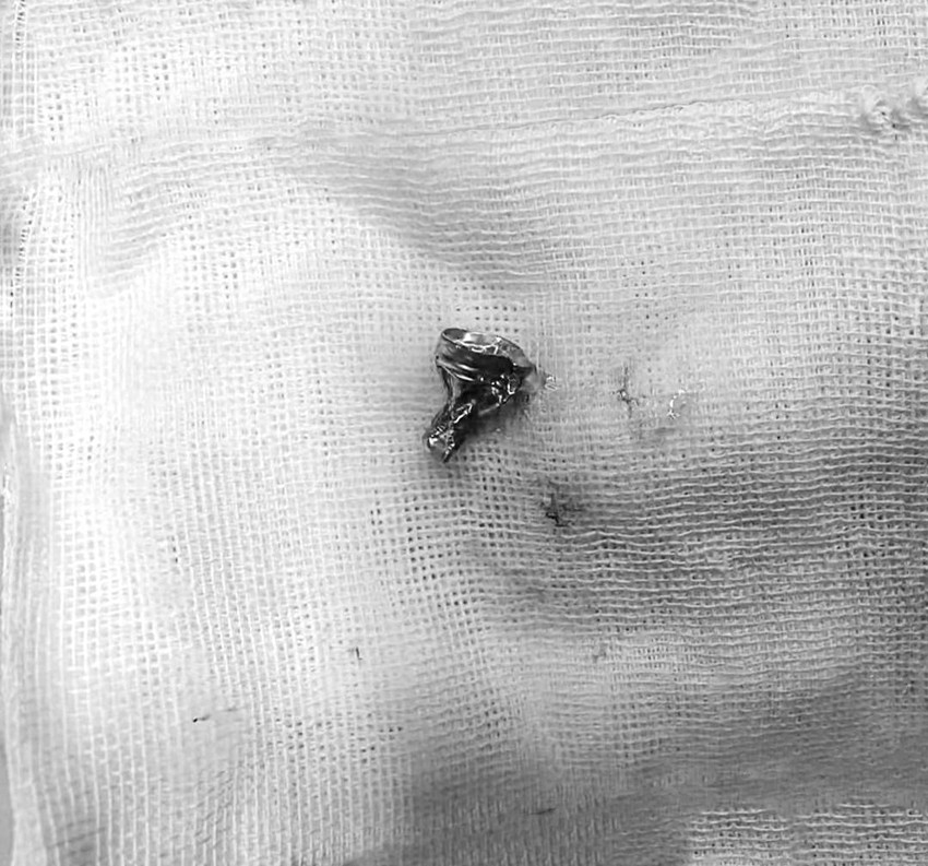 手術(shù)于1月5日13時開始,在醫(yī)院呼吸與重癥醫(yī)學(xué)科、消化胃腸鏡室的支持下,兒科與麻醉科醫(yī)護人員密切合作,兒科醫(yī)生劉勤、張雪瓊冷靜操作、沉穩(wěn)手術(shù),最終將異物成功取出。經(jīng)仔細(xì)檢查,異物為一扭曲變形的鉛筆頭鋁箍。