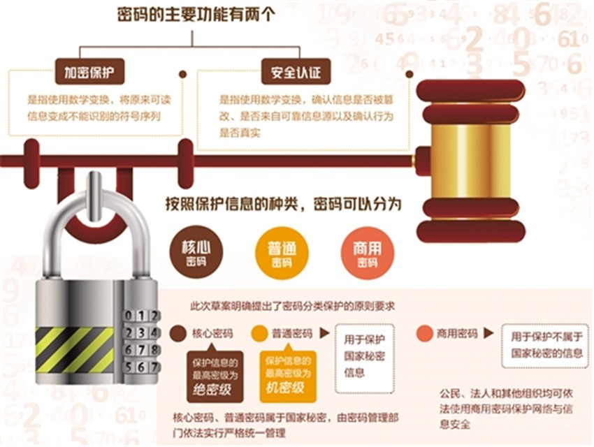 為了確保核心密碼、普通密碼安全,增強(qiáng)密碼通信服務(wù)和網(wǎng)絡(luò)空間密碼保障能力,此次草案中規(guī)定了核心密碼、普通密碼的主要管理制度:明確了傳遞、存儲(chǔ)、處理國(guó)家秘密信息時(shí)的核心密碼、普通密碼使用要求;規(guī)定密碼工作機(jī)構(gòu)應(yīng)當(dāng)依法建立健全安全管理制度,采取嚴(yán)格的保密措施;規(guī)定密碼管理部門(mén)依法對(duì)核心密碼、普通密碼工作進(jìn)行指導(dǎo)、監(jiān)督和檢查,會(huì)同有關(guān)部門(mén)建立核心密碼、普通密碼安全協(xié)同聯(lián)動(dòng)機(jī)制,明確了相關(guān)案事件處置程序;規(guī)定國(guó)家加強(qiáng)密碼工作機(jī)構(gòu)和核心密碼、普通密碼人才隊(duì)伍建設(shè);明確了核心密碼、普通密碼有關(guān)物品和人員享有免檢等便利;規(guī)定了密碼管理部門(mén)、密碼工作機(jī)構(gòu)對(duì)其工作人員的監(jiān)督和安全審查機(jī)制。