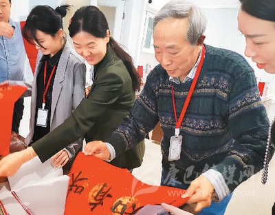 星堡香山長者公寓的住戶李爺爺在展示他和朋友們一起寫的對聯(lián)。