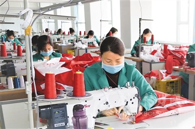 近期,甘肅省平?jīng)鍪徐o寧縣在做好疫情防控工作的同時(shí),積極推動(dòng)縣內(nèi)扶貧車間復(fù)工復(fù)產(chǎn)。截至目前,全縣57家扶貧車間已有39家恢復(fù)生產(chǎn),吸納帶動(dòng)了536名貧困群眾在家門口就業(yè),增收致富。圖為靜寧縣城關(guān)鎮(zhèn)的村民在當(dāng)?shù)匾患曳鲐氒囬g縫制衣服。王 毅攝(人民視覺)