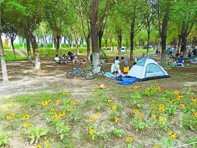 27日,端午小長假最后一天,在大運(yùn)河森林公園露營區(qū),市民在保持安全距離的前提下,支起帳篷,休閑度假。