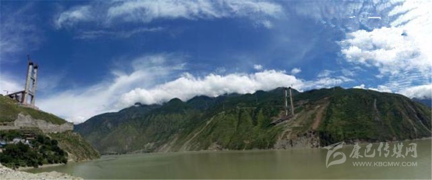 沿國道318線繼續(xù)往康定方向走,奔涌的大渡河鑲嵌在連綿起伏的山巒之間。車行一段距離后,矗立在河兩岸的兩座高聳的橋塔映入眼簾。這就是建設(shè)中的“川藏第一橋”——瀘定大渡河興康特大橋。