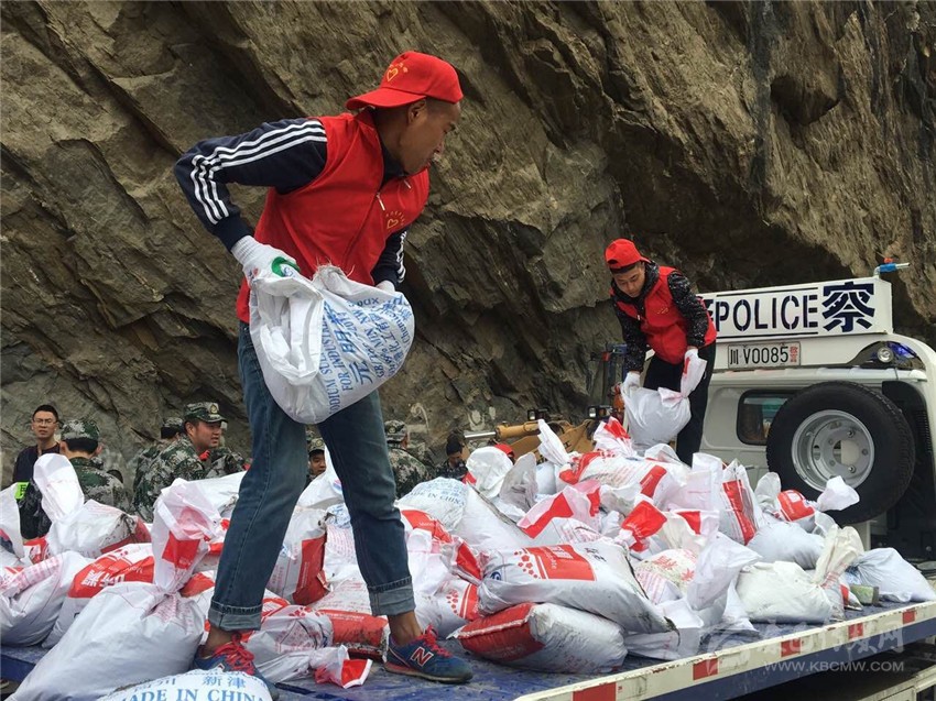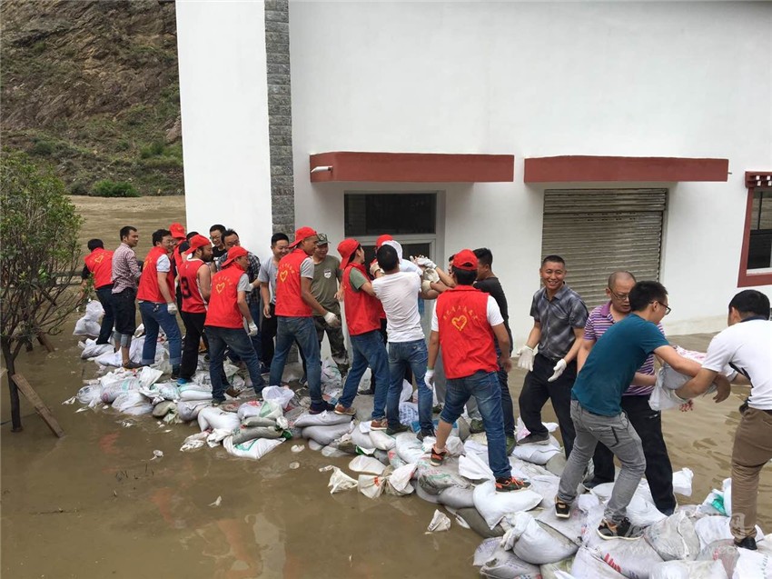 志愿者正在丹巴縣抗洪現(xiàn)場搬運沙袋。