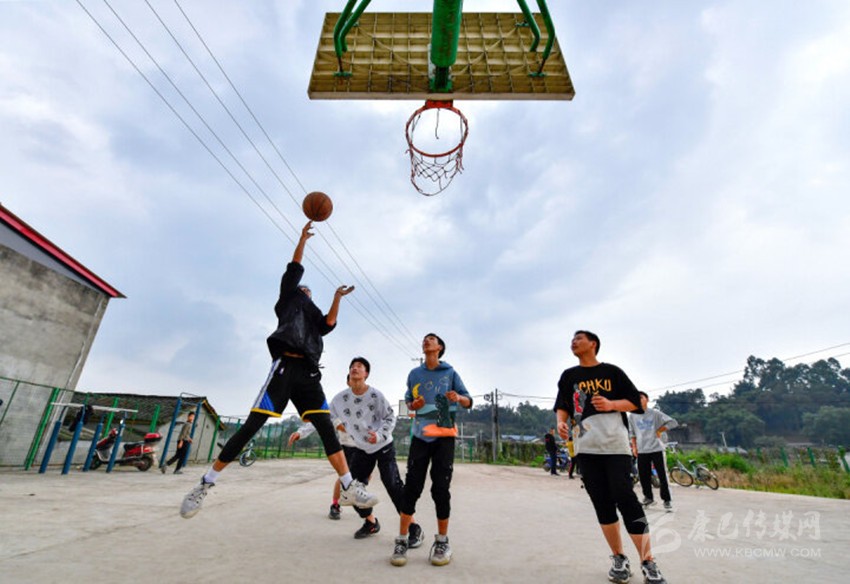 ? 東坡區(qū)松江鎮(zhèn)丁塘村村民正在村籃球場上進(jìn)行一場3對3對抗賽。丨眉山日報全媒體記者 楊槐 攝